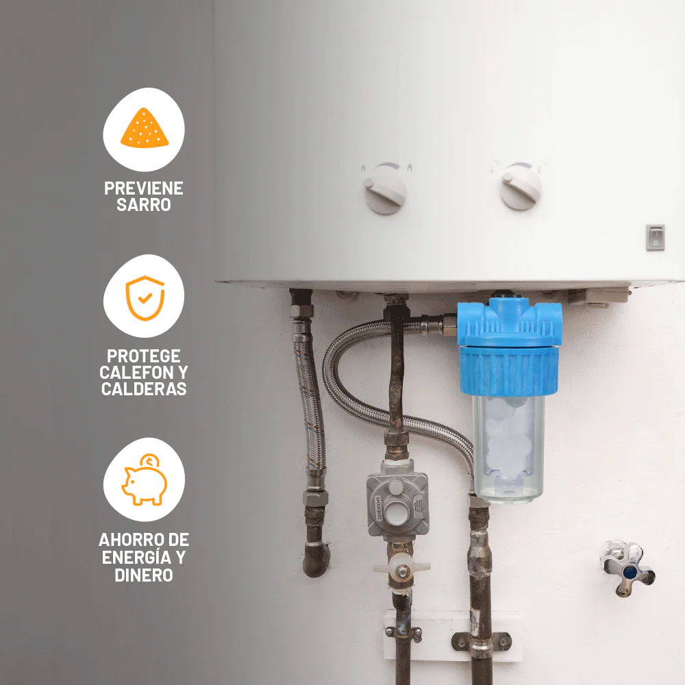 Funciona con esferas de polifosfato que mantienen en suspensión el calcio y el magnesio evitando que estos se junten y por lo tanto formen sarro. Es importante tener en cuenta que este filtro de sarro para calefont no elimina el sarro 100%, previene su formación dejando el calcio y magnesio en suspensión. A diferencia de nuestro filtro para calefont anterior, este filtro antisarro reemplaza solo los cristales de polifosfatos que hay en su interior, logrando así un ahorro económico y una mayor eficiencia en remoción de sarro ya que remueve hasta 500ppm, no instalar en contacto al sol.