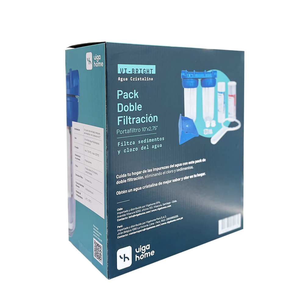 Este Pack doble filtración viene con 2 portafiltros y 2 filtros, uno de Polipropileno que captura los sedimentos y otro de Carbón Block que permite estar libre de cloro y otros químicos presentes en el agua .